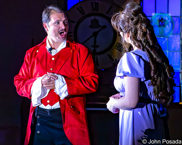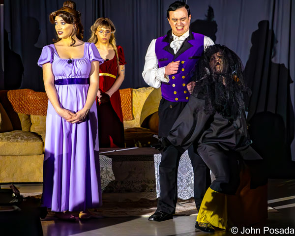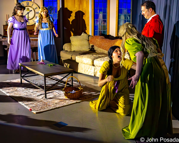 Other cast included the villainous Mr. Wickham and flappable Mr. Collins (both played expertly by Dylan Manigian), Lizzy’s no-nonsense best friend, Charlotte Lucas (Miranda Gale), the adorable Mr. Bingley (Anthony Lundy) and ineffable Miss Bingley (Tatiana Cifuentes), and the imposing Lady Catherine deBourgh (Erica Claggett) who swept into the show in Act Two with a tablecloth and a mission: keep Elizabeth Bennet away from Mr. Darcy.