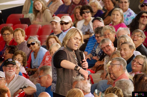 At the conclusion, Collins descends the stairs and makes his way into the audience. Here, he takes note of two Texas Tenors fans in the front row, announcing to the crowd that the pair has traveled all the way from Maine for today’s performance.