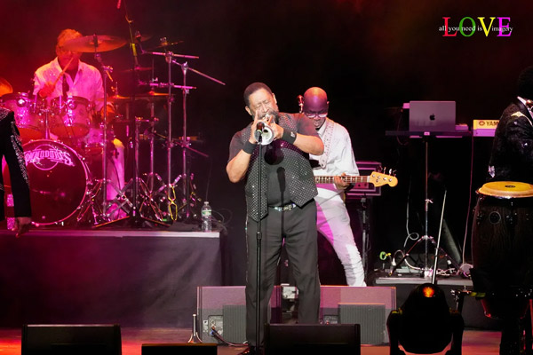 Inside the BergenPAC auditorium, executive director Alexander Diaz welcomes the crowd before members of The Mean Machine backup band — keyboardist Maurice Gregory, bassist Tyron Stanton, drummer “Scott” Kay, and keyboardist/musical director Thomas Dawson — take the stage along with The Commodores featuring vocalists Cody Orange and Brent Carter, guitarist/vocalist Colin Orange, and founding member William “WAK” King on trumpet, guitar, keyboard, and vocals.