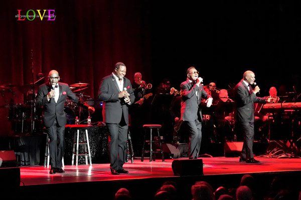 The lights dim and the curtain rises to reveal a stage filled with musicians on guitar, bass, keyboards, drums, percussion, and horns who play an instrumental medley of Four Tops hits before the audience hears the announcement, “This performance — and every Four Tops performance — is dedicated to the memory of Lawrence Payton, Renaldo ‘Obie’ Benson, Levi Stubbs, and ‘Duke’ Fakir.”