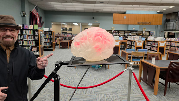 Anthony Lombardi, a staff member from the Johnson Public Library, points to the brain exhibited in 'Mind Your Feelings'. Photo by Northern New Jersey Community Foundation