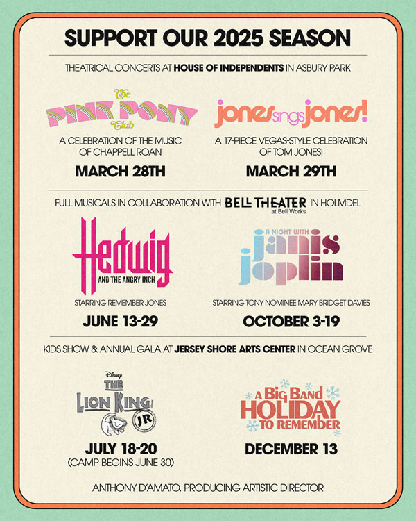 The 2025 season includes two theatrical concert events at House of Independents in Asbury Park: The Pink Pony Club, a celebration of the music of Chappell Roan (with a cast of 25 young singers, musicians, and drag queens) on March 28th, and JONES SINGS JONES!, a 17-piece Vegas Style celebration of Tom Jones on March 29th. As of this release, both shows are close to sold out.