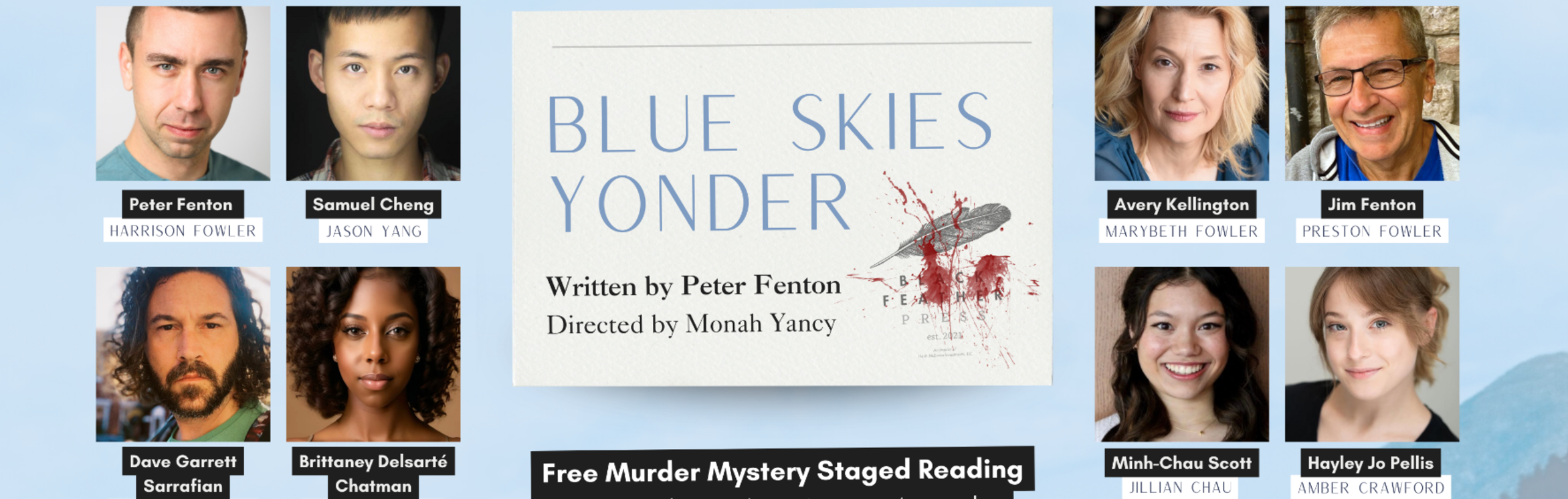 (TRENTON, NJ) -- A free staged reading of Blue Skies Yonder, a new dark comedy by Peter Fenton, will take place at Artworks in downtown Trenton on Sunday, October 19, 2025 at 2:00pm. This event will be the play's first public presentation. The reading is directed by Trenton actress, writer, and acting coach Monah Yancy and stars Fenton himself in the role of Harrison Fowler. Both Fenton and Yancy are members of the administrative staff of Passage Theatre, the only professional theater company in Trenton.