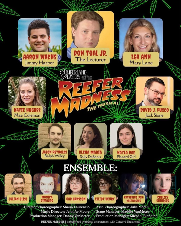 (VINELAND, NJ) -- Cumberland Players presents Reefer Madness, the Musical across two weekends from June 19-28, 2026. When a clean-cut kid from a stand-up American family falls prey to marijuana, his descent into the pit is filled with jazz, sex and violence. This pointed polticial satire will go straight to your head!