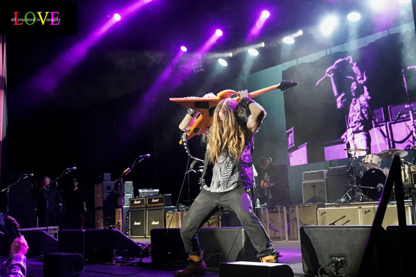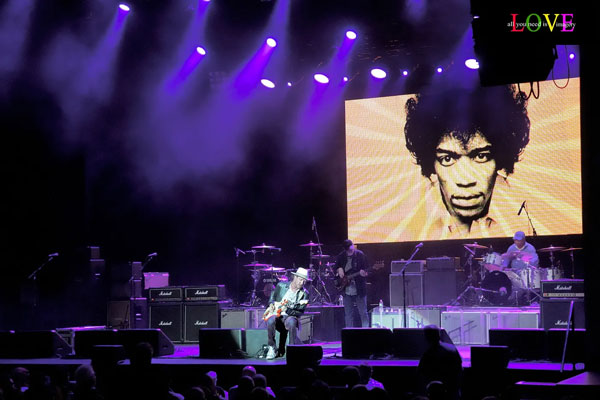 Back on stage, Wylde plays with his guitar behind his back to flashing purple lights as an image of Hendrix appears on the screen behind him.