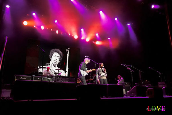Shepherd asks, “Has everyone had a good time tonight?” before acknowledging, “We all come from different musical backgrounds, but we are all influenced by Jimi Hendrix!”