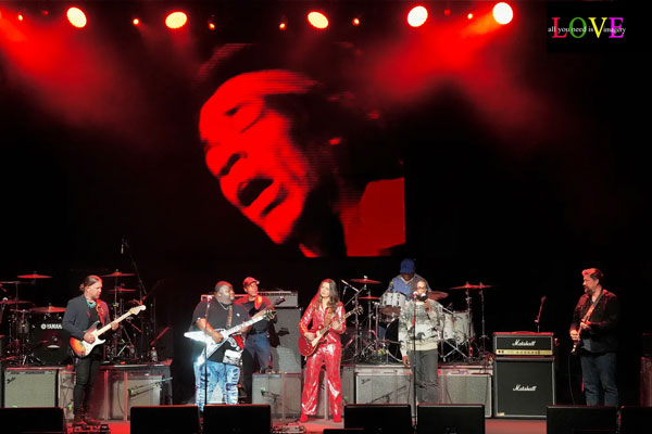 Janie welcomes to the stage vocalist Henri Brown who, backed by guitarist Mato Nanji, bassist Orlando Wright, drummer Sam Bryan, and pedal steel guitarist Robert Randolph, launches into “Foxy Lady.”