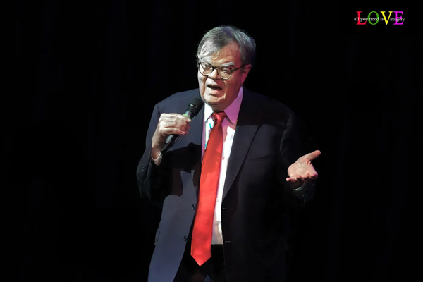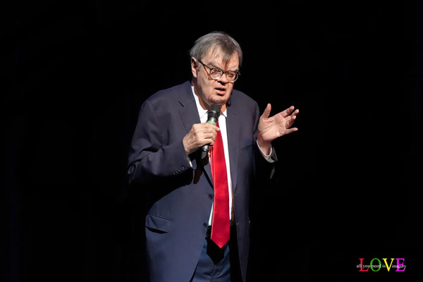 The lights dim and Keillor, 83, takes the stage chanting in a sing-song voice, “You have come to see an historic man/From back before social media began.” After he asks audience members to join him in singing an a cappella rendition of “America,” fans vocalize, “My country, ’tis of thee/Sweet land of liberty,” while Keillor renders a countermelody.