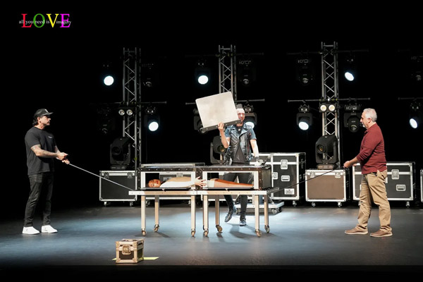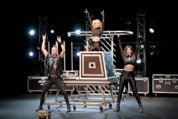 Leon chooses two volunteers from the audience, Mike and Tom, who take the stage. As a rock version of Carl Orff’s Carmina Burana plays, the men help to restrain Chelsey while Leon uses a blade to saw her in half.