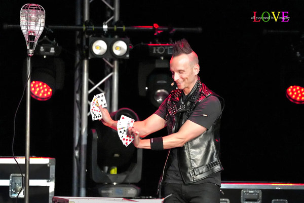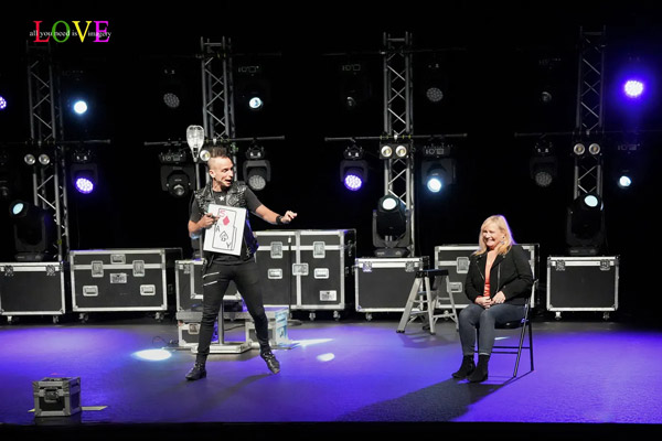 Karen from Manchester — who helped Leon with his “guess the card” trick — confesses, “When I first went up on stage, I felt a little uncomfortable, but after awhile, I just had a good time with what he was doing,” exclaiming, “I was in shock that he was able to identify my card and was able to do the magic with the drawing — and then he gave it to me!” prior to adding, “The whole show was fascinating and Leon was incredible!”