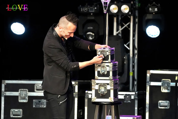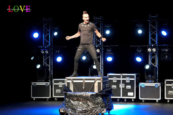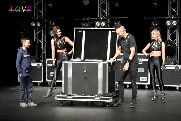 The lights dim and a video introducing Etienne plays before lights flash and Leon appears center stage and makes his assistant, Chelsea Lacongo, materialize out of an empty box.