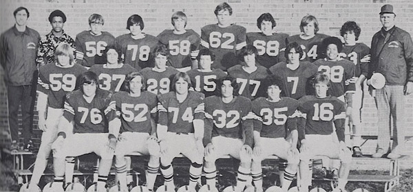 Greg Amici, No. 74, is pictured on the East Brunswick High School Football Team coached by George W. Pinfield, top far right, the father of legendary DJ/VJ Matt Pinfield, a childhood friend of Greg. PHOTO COURTESY OF GREG AMICI