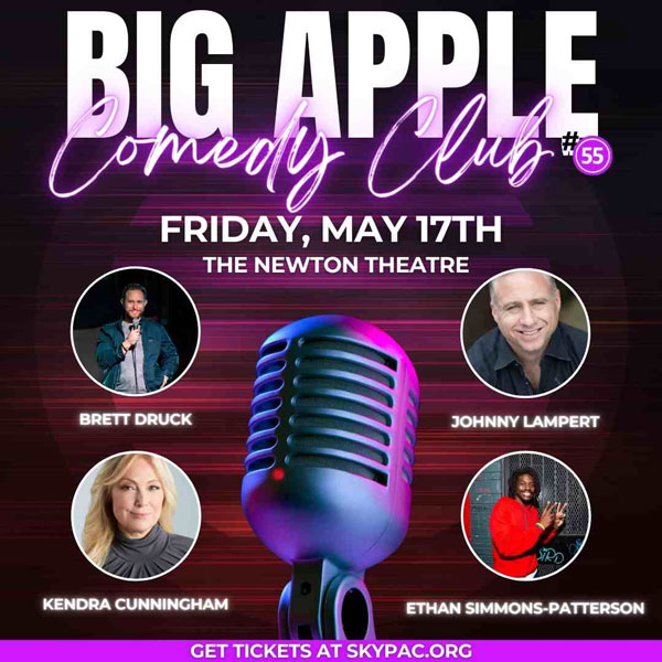 (NEWTON, NJ) -- The Newton Theatre presents Big Apple Comedy Club #55 on Friday, May 17, 2024 at 8:00pm. The night includes performances by four comedians: Brett Druck, Kendra Cunningham, Johnny Lampert, and Ethan Simmons-Patterson.