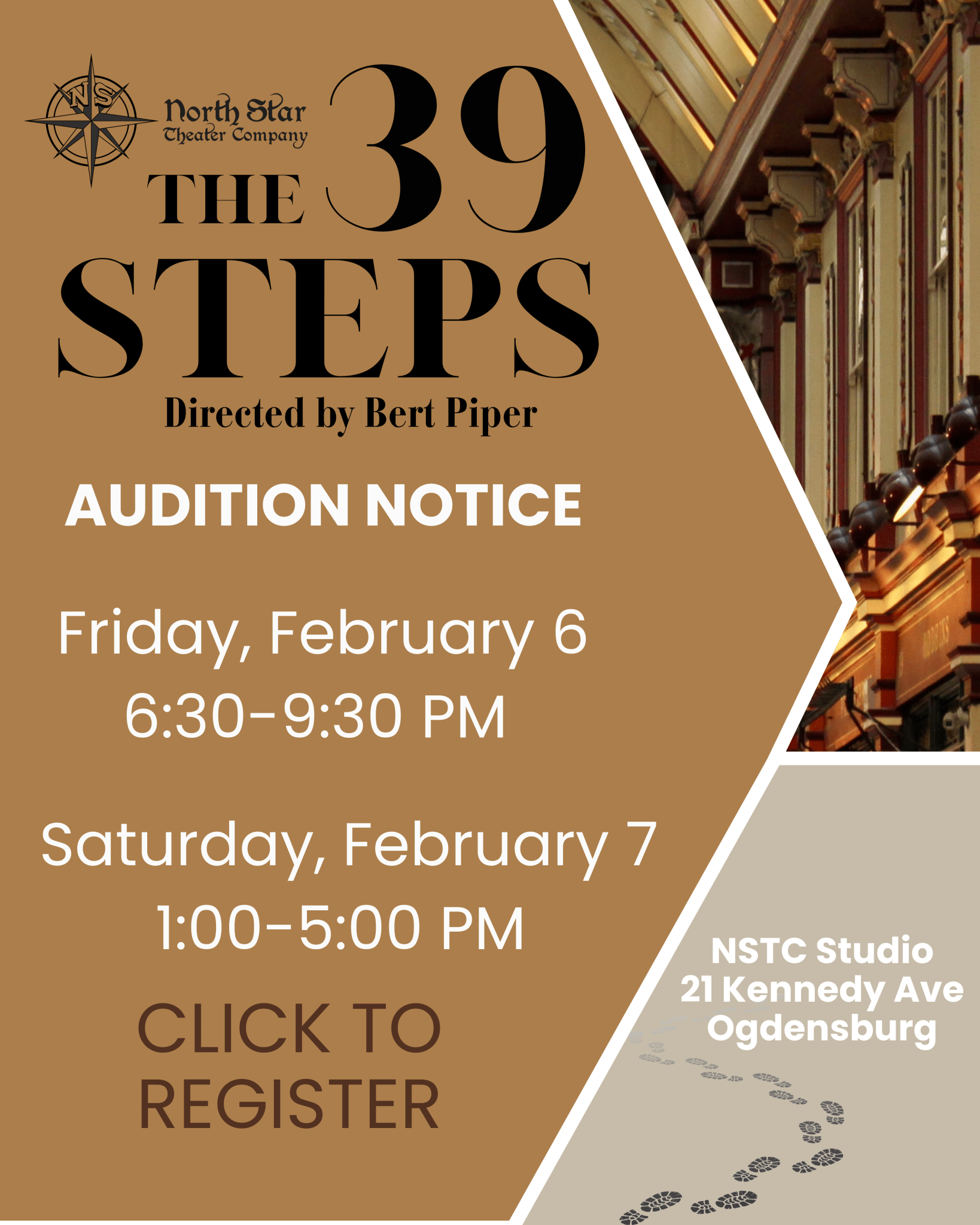(OGDENSBURG, NJ) -- North Star Theater Company will hold auditions for its upcoming production of The 39 Steps on Friday, February 6 from 6:30pm–9:30pm and Saturday, February 7, 2026 from 1:00pm–5:00pm at the NSTC Studio (21 Kennedy Avenue) in Ogdensburg, New Jersey.