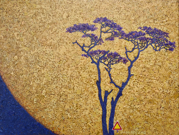 In Sungmo Cho’s works, the recurring theme of ‘trees’ serves as a central motif that connects nature and the essence of human experience. Through the imagery of trees, the artist bridges the divide between nature and civilization, creating a unique artistic language that merges traditional aesthetics with modern thought. His trees are both tranquil and powerful, reminding us of the interdependence between nature and humanity, conveying profound messages to the viewer. Specifically, the upright trees serve as symbols of nature while also metaphorically representing his experiences of immigration and identity. The roots of these trees symbolize the identity of an immigrant, while the branches suggest future growth and expansion, encapsulating his immigrant journey and life path. The tree imagery embodies the artist’s personal journey from Seoul to Pratt Institute in New York, via his studio in Long Island City, and ultimately to Sarang Mountain, signifying a progression toward a new life. The simultaneous presence of trees and road signs in his works reveals an artistic insight into seeking harmony and balance at the intersection between civilization and nature.