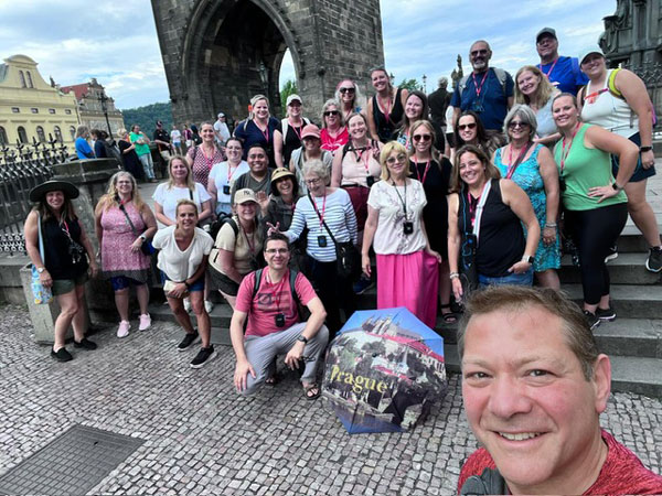 A group of 30 NJEA educators and Holocaust survivor Maud Dahme gather in Prague in July 2023 during a 10-day NJ Holocaust Commission trip.