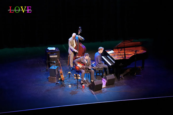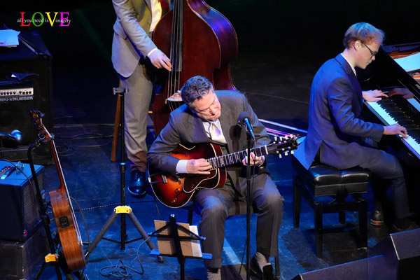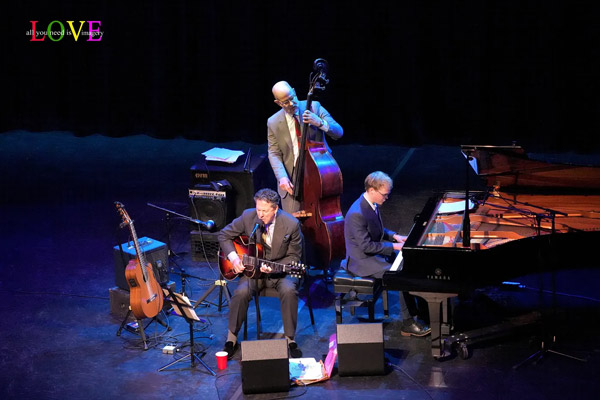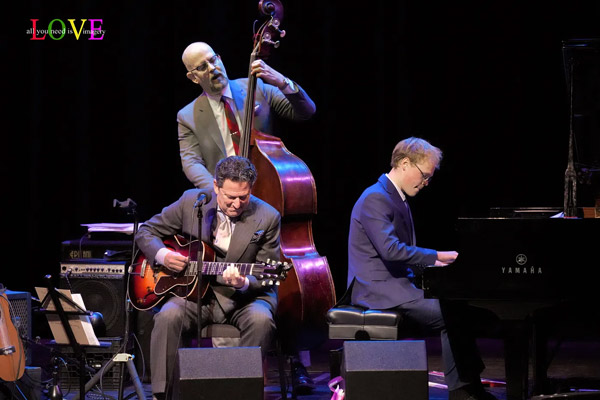 Inside the cozy SOPAC auditorium, Executive Director Lana Rogachevskaya introduces John Pizzarelli who takes the stage along with bassist Mike Karn and pianist Ben Collins-Siegel. Welcoming the crowd, Pizzarelli explains, “Tonight’s show is called Swinging into the Holidays and More, but we’re gonna do the ‘more’ first and then work our way over to the holidays to send you out in a very festive mood!”
