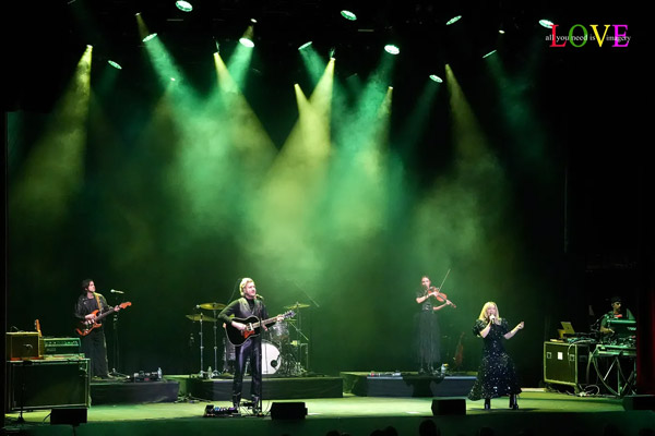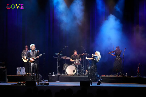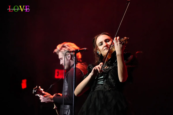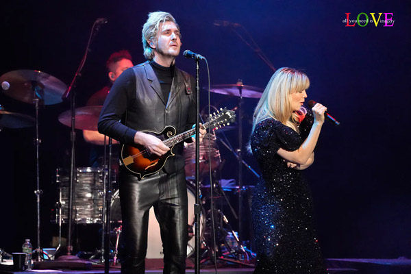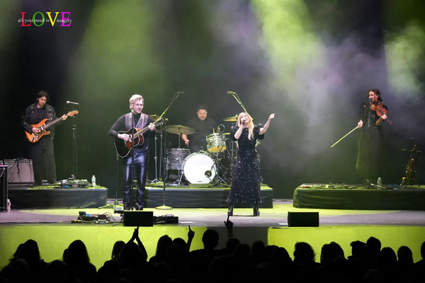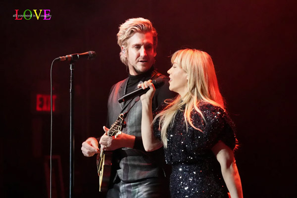 Concertgoers hoot and holler as Costello plays electric guitar and Perry accompanies herself on acoustic on the strummy Band Perry country ballad, “Ghosts,” where Tessa Dalton contributes a key orchestral string part on the violin.