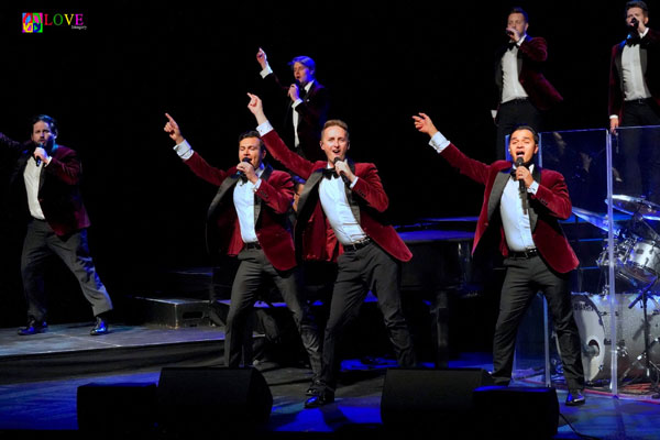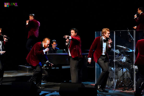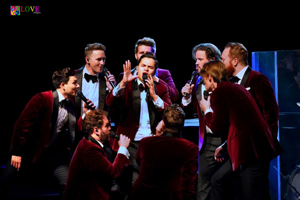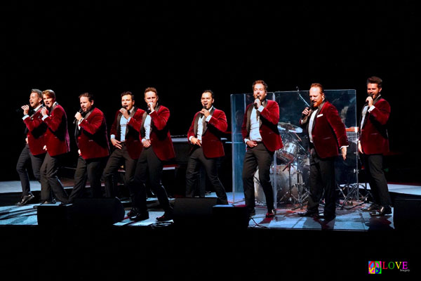 The lights dim and keyboardist Jack Lipson and drummer Russ Nyberg take the stage as the sounds of synthesized music and live percussion are joined by off-stage tenor vocalizing which radiates throughout the darkened theater. The lights come up to reveal nine singers — Cameron Barclay, Grady Swithenbank, Daniel Belle, Nigel Huckle, Jared Newall, Adrian Li Donni, Michael Edwards, Boyd Owen, and Sebastian Maclaine — singing a lively rendition of “Funiculi, Funicula” in Italian.