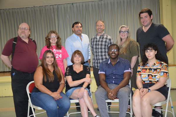 The cast of The Musical Comedy Murders of 1940 includes (seated, I to r) Victoria Lopez, Annette Winter, Delvin Duncan, Pamela Yachouh; (back row, l to r) Stephen Burke, Roselynn Gauthier, Carl Bergmanson, Neal Hallinan, Rebecca Mazumdar, and Greg Schultz.