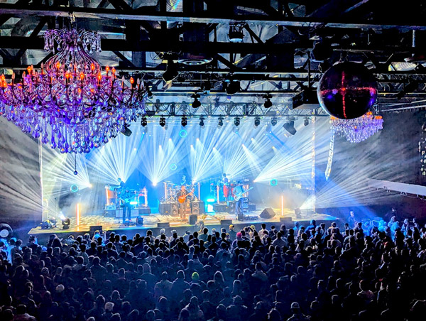 Up next was one of the more familiar opening rifts from UM, 2009’s 1348. Another classic blend of high-octane rock with Zwang groove and another stellar example of UM evaluation creating space for the even pull of each band member jamming full sail in synchronized direction. So close to Valentine’s Day, UM entered an ethereal romantic rendition of Neil Young’s Harvest Moon, complete with a pink light wash, lit candles on the venue’s multiple chandeliers, and a slow starry spin from the many disco balls in play. Scotty did an excellent job building tension juxtaposed by Brendan’s vocals. Joel then breaks through the dreamlike sway with his opening in 2013’s Slacker. The stop start momentum of this song is also highlighted by a breakdown slapped by Stasik.