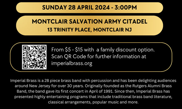 Imperial Brass will feature Levi Boylan – the Principal Trombonist of the NJ Symphony Orchestra, in a concert at the Montclair Salvation Army Citadel (13 Trinity Pl, Montclair, NJ) on Sunday April 28, 2024 at 3pm. The program will include Ferdinand David’s. “Concertino for Trombone”.