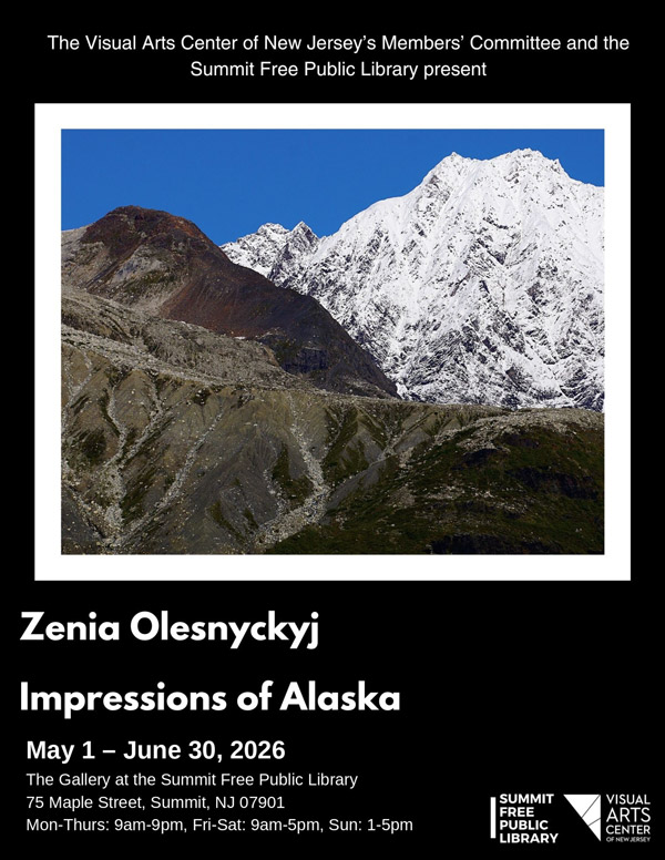 (SUMMIT, NJ) -- The Gallery at the Summit Free Public Library will present Impressions of Alaska, a twenty-piece exhibition by New Providence artist Zenia Olesnyckyj, from May 1 through June 30, 2026. The exhibition is presented by the Visual Arts Center of New Jersey's Members' Committee and the Summit Free Public Library. Admission is free and open to the public during regular library hours.