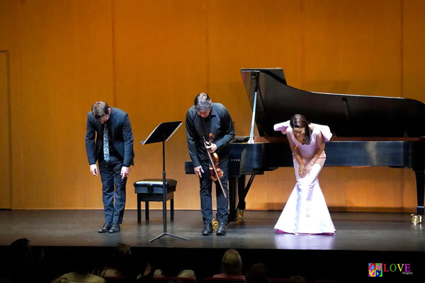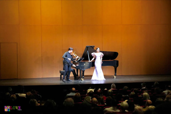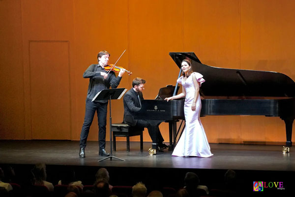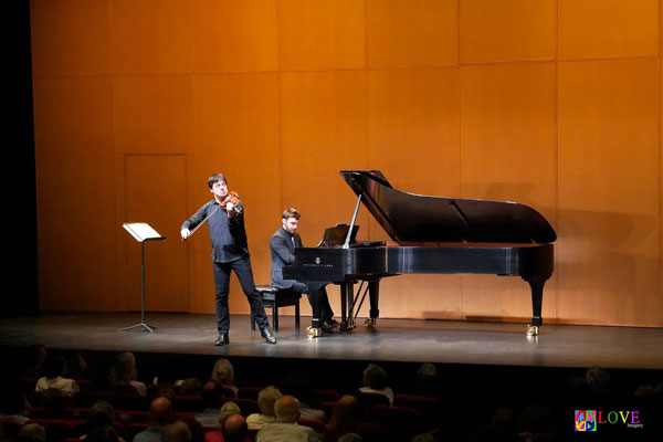 Inside the McCarter auditorium, Joshua Bell and Larisa Martínez take the stage along with pianist Peter Dugan and open tonight’s program with “Ah, ritorna, età dell’oro” from Infelice by Mendelssohn.