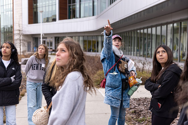 Stockton senior Breanna Hawkins, points out some birds on campus to a group of middle schoolers who attended her Tween Tech workshop. Hawkins, of Marshall, Michigan, is the president of Stockton's Birding Club, and she showed the students how to use the Merlin Bird ID app to identify birdsong on their phones. Photo by Susan Allen, Stockton University