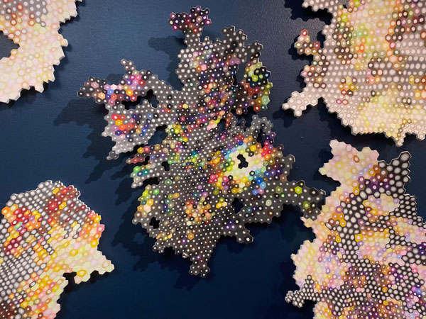 That generosity of spirit reoccurs in the “Tectonics” pieces: amalgamations of paper and foam divided into hundreds of little colored hexagons, curved at the edges like eggshells and held to the wall by magnetic force. Because of the artist’s color choices, parts of this beehive seem to shine with inner illumination, but no one hex is given prominence over any other. This is a spiritual vision rather than an astronomical or geological one. It’s the universe re-coded according to the artist’s priorities — her imposition of mystic order on the sprawling darkness and the mute, rumbling earth.