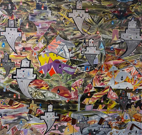 “Ghost Town #6” doesn’t provide a solution to the riddle, but it does deliver some hard hints. Brickey has literalized the title by making the buildings themselves into specters, complete with Casper-like tapering tails. Decked out in battleship gray, they streak away from a wild and uneven landscape — but they’re still tethered to it. The bombardment is back, too: a swarm of five-pointed terrors, star insignias in red and black teardrops that look as if they’ve been ripped from the fuselage of a WWII fighter. Just as he does in “Citadel,” he leaves the viewer nowhere to hide. This canvas is covered from corner to corner with brilliant trouble.