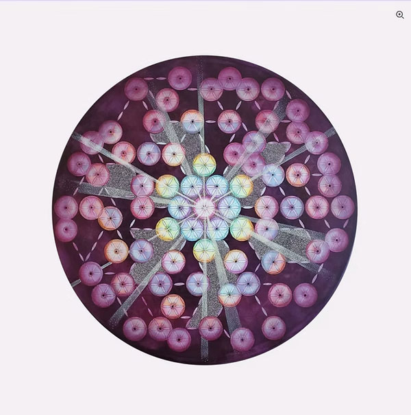 “Torus,” a great, sumptuous purple circle of a painting that the artist showed at “The Sacred and Sublime,” her 2023 exhibition at the Carr Hall Gallery at St. Paul and Incarnation (38 Duncan Ave.), feels like a map of a friendlier galaxy than the one we know. Spheres subdivided into six segments cluster around a central star that shoots forth beams of particle-rich, white dotted matter (Niewodowski assures us that the acrylic paint glows in the dark; I believe her). The rays reach out to embrace the viewer. Is this the beginning of time, or the streaming of a new idea from the pineal gland of an enlightened creator? Or is that the same thing?