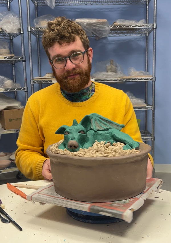 Bell grew up in Princeton and graduated from Rowan University in 2019 with a Bachelor of Science in MIS. During his last semester, he took one ceramics class, but could not foresee the art form becoming such a big part of his life. “I work for my family’s small business and, until recently, I did not consider myself to be much of an artist. About 3 years ago, I got my hands back into clay and I am so grateful. I started taking beginner ceramics classes at the Arts Council where I found a passion for sculpting dogs.”