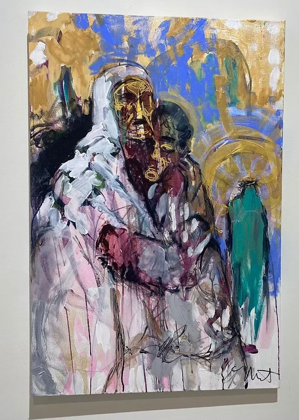 Perhaps he’ll look like the character in “Shadows of Certainty,” composed of splotches of color and pigment-drippings, held together by the centrifugal force of pure determination. Better still is “Echoes of Resolve Through the Veil of Thought” (all of his titles sound like PM Dawn songs), a picture in profile of a man with his head tipped back and his bushy black beard interposed between him and his destination. He’s got his eyes closed, and the golden outline around his face makes it seem like he’s basking in the sun. Just as Niefert’s “Brother” alludes to images of the Madonna and Child, “Veil of Thought” echoes portraits of the saints — men and women who refuse to let outward difficulties derail their profound inward experiences.