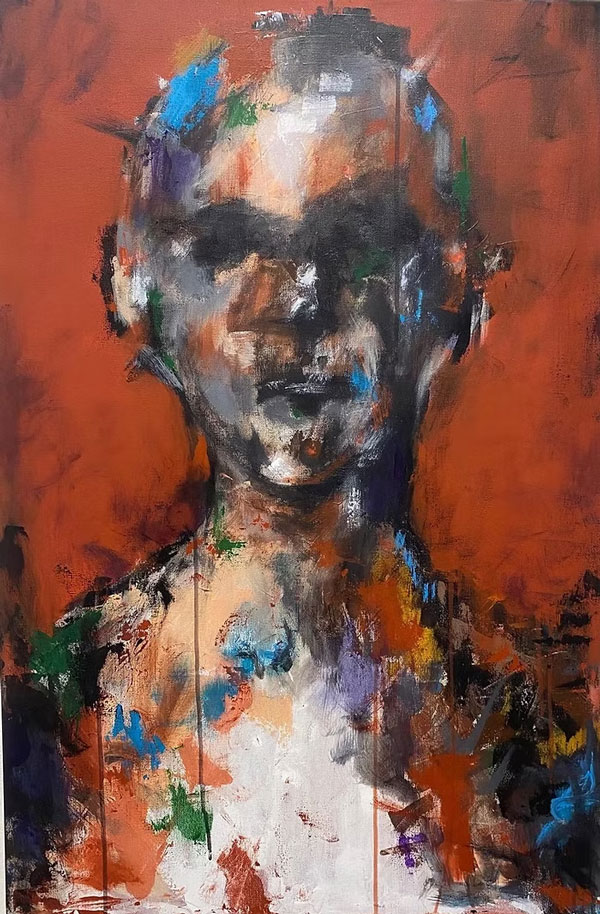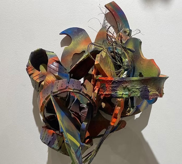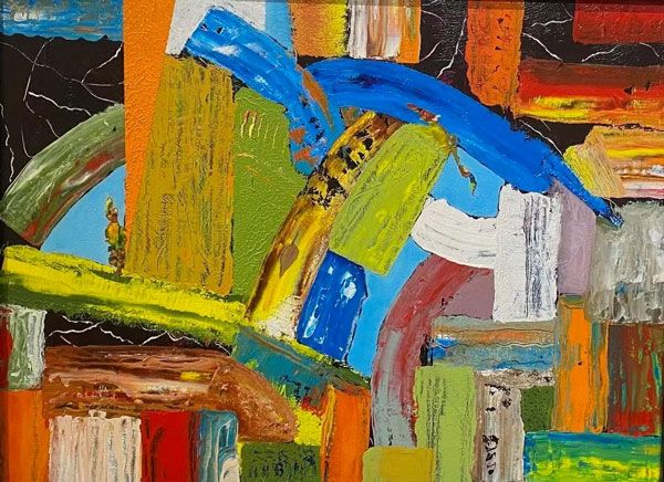 If you’ve been in Hudson County galleries, you’ve seen pieces like Campbell’s: junk, locally sourced and artfully arranged in spectacular heaps. Jack Henry has pieces that fit that description at the Majestic Condominiums right now. But I don’t think I’ve ever seen industrial waste painted such cheerful, flamboyant colors, or kissed quite as passionately by the rainbow. This is the extra flavor we’ve come to expect from a Jerome China show: vibrancy, passion, inversion of expectation, well-what-do-you-think-of-that impertinence. Even the nonfigurative pieces in “I Said What I Said” carry narrative dynamism.