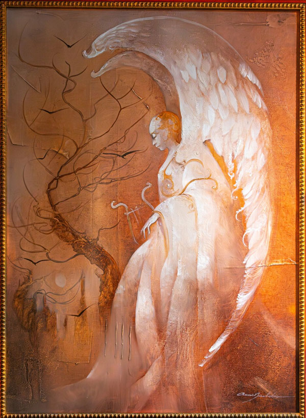 Anne Bachelier was born in Louvigne du Desert, France and received her degree from the Ecole des Beaux Arts, La Seyne-Sur-Mer, between 1966 and 1970. A master of Surrealism, line, and detail, Bachelier feels her art. She does not overthink it. “It’s my hand that works. I don’t think about technique. If I were to think about technique, it is like walking on a tightrope. The moment you look at your feet, you fall down.” Her process begins with the creation of her canvas. Stretching fabric across wooden stretcher bars, stapling it in place, priming the canvas. Nothing ready-made, she brings it all to life from naught. Perhaps it is this element of birth from nothing that evokes such emotion in her patrons. She tells tales of patrons so overcome with sentiment that Bachelier herself worries for them. The responsibility for these reactions can be overwhelming for Bachelier, but it is this gift, her art, that connects so many.