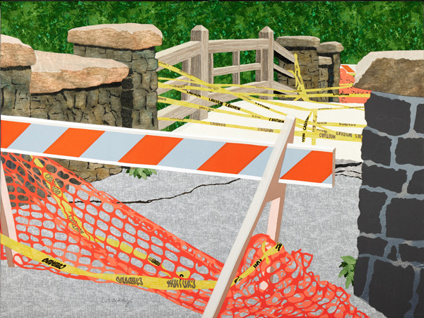 In the second floor atrium, "textile painter" Lisa Lackey defies perception, creating large canvases that viewers assume to be painted, only to discover, upon closer inspection, that they are, in fact, created with fabric, string, yarn, and cloth. Her unique fabric/paper collages memorialize glimpses of time and the hidden delights of ordinary places. Approaching her subjects from unusual angles/ perspectives, her works reveal the beauties found in daily life: the intersecting lines and complex textures of a construction site with police tapefencing and a colorful sawhorse (Momma Said There'd Be Days Like This),, the shadows cast by human figures and a chain link fence (Connections), the conversation implied by two empty Adirondack chairs left facing one another (Can We Talk?), or the social gathering suggested by the empty chairs, and an unfinished drink (Oyster Bar). In a very real sense, Lackey is teaching the viewer to see anew – to draw inferences from settings - and to appreciate the uniqueness of ordinary places that surround us all.