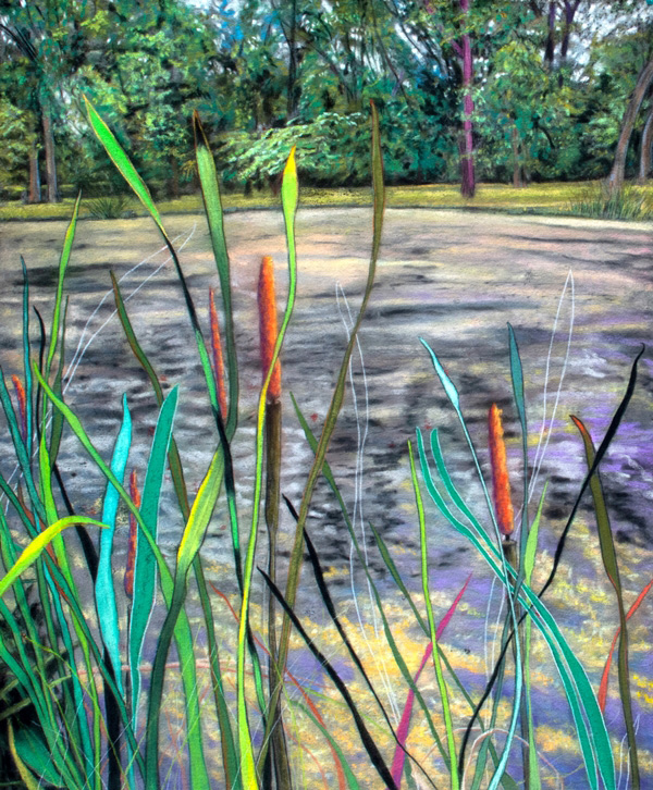 Contrast and serenity can be found in artist Neal Korn's paintings of the natural world that fill the third floor. Far from just capturing the beauty of nature, Korn's works approach the representation of New Jersey's wild areas, parks, rivers, lakes, and streams with a unique eye for detail, an often unconventional framing and the use of a fanciful color palette to enhance or transform an ordinary scene into something extraordinary. Hacklebarney State Park never had hot pink and blue tree limbs nor do the real cattail reeds appear in neon turquoise, chartreuse and orange as in Nomahegan 9. Framing his subjects from unconventional perspectives, he intrigues the viewer, as in the looming, confrontational cacti in Phoenix, Arizona or the tilted rocky shore of Echo Lake, NJ, Also a surrealist artist skilled in portraying psychological elements, Korn's selection in this exhibit focuses on the power of nature to restore serenity and provide comfort in the troubled, fractious world of today.