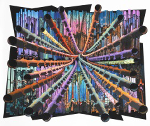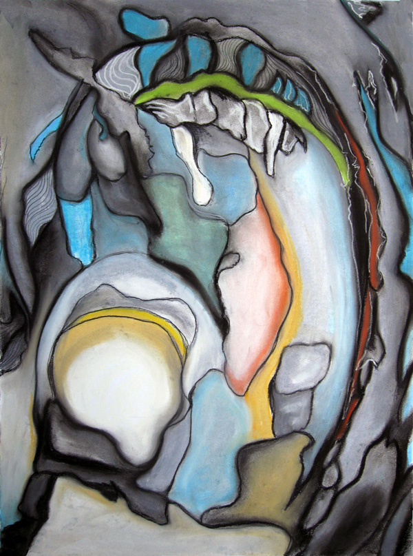 Another prolific and fascinating artist, Len Merlo describes his works as "meditations on memories, perception, time and place" and the selection on view in the fourth floor atrium and hallway areas only hints at the range of media in which he is fluent. Beyond his selection of pastels, collages, prints, and paintings displayed Merlo is widely known for his exceptional printmaking skills and for his work in monotypes, encaustics, etching, linocuts and sculpture. In this exhibit, his palette varies, from the intense and yet delicate coloring of his pastels (Oyster Shell series) to the muted earth tones associated with industrial elements. In some works, he incorporates fanciful, bold colors of imaginary landscapes or whimsical, strangely hued hand shapes (the Hand series), and intriguing combinations of organic and geometric forms within compartmentalized compositions. Blobs of color intersect precise lines, ladders ascend to mystical heights or map-like roads take us through landscapes below alien organic forms. His titles also reward that "closer look," with their literate (and often philosophical), reflective or poetic quality.