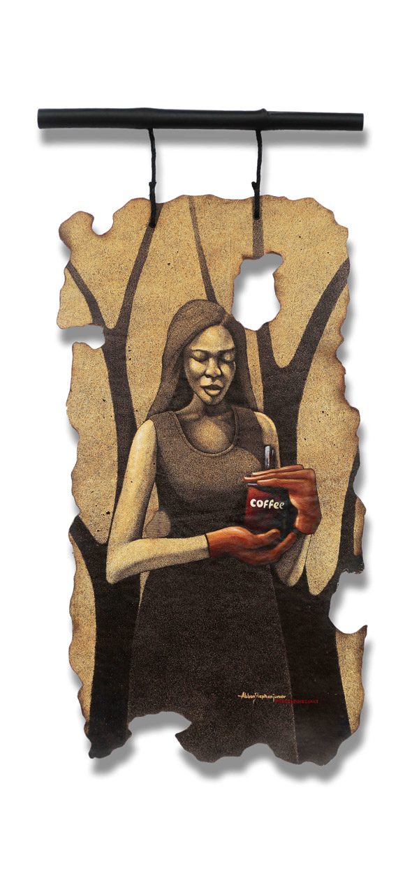 In the “Bobo” series, Abban turns his focus to women’s role in environmental stewardship, highlighting their innovative practice of upcycling discarded household and commodity materials. These works embody resourcefulness and ecological consciousness, reflecting how women transform waste into sustenance—acts of preservation that assert an unspoken authority over sustainability and the survival of community.