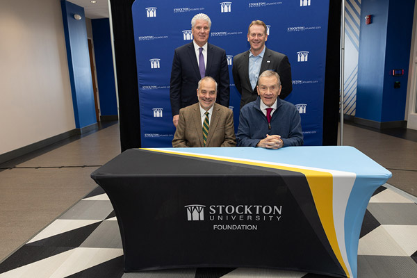 Stockton University President Joe Bertolino, left, and former New Jersey State Senator Bill Gormley sign an agreement to create the $2 million Levine-Gormley STEM Scholars Pathway Program in a ceremony at Stockton’s Atlantic City campus on Jan. 30. Lee Levine (not pictured) was present for the ceremony virtually. Photo by Susan Allen/Stockton University