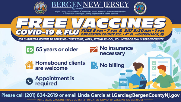 (HACKENSACK, NJ) -- Bergen County Executive James J. Tedesco, III and the Board of County Commissioners, in coordination with the Bergen County Department of Health Services, are reminding residents that free COVID-19 and influenza vaccines are available for eligible children, adults, and seniors through the end of March.