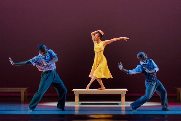 Alvin Ailey American Dance Theater's Solomon Dumas Constance Stamatiou and Xavier Mack in Fredrick Earl Mosley's Embrace. Photo by Paul Kolnik