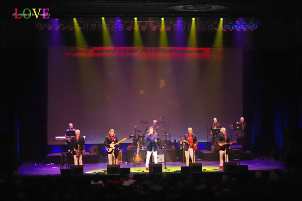 Vocalists Jay Reincke and Marty Sanders, guitarists Sandy Deanne and Darren Dowler, and bassist Lenie Colacino take the stage along with keyboardist Mark Baron, drummer Rick Van Horn, and a two-piece horn section. Opening their set with “Only in America,” Jay Reincke sings in his smooth deep voice, “Only in America/Can a guy from anywhere/Go to sleep a pauper and wake up a millionaire,” accompanied by rich vocal harmonies and strong instrumental backup on this upbeat 1963 pop-rock tune.